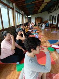 Comenzamos a las 6:45 am Pranayama y Clase de Yoga (1 practica por día). Después seguimos con Kirtan (canto de mantras). Cada persona trabaja en Karma Yoga (servicio desinteresado) 4 horas al día.